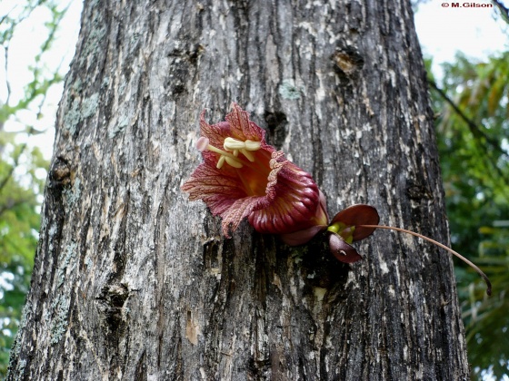 Locally known as the Jicaro or Calabash Tree, is species of flowering plant that is native to Central and South America. Largely pollenated by bats eating the inside of the fruit with the seeds. Not to be confused with the calabash gourd used in Sherlock Holmes pipe. It is a dicotyledonous plant with tripinnate leaves whose gourds grow out of the branch of the tree.