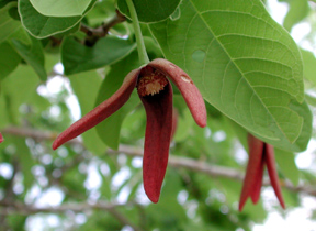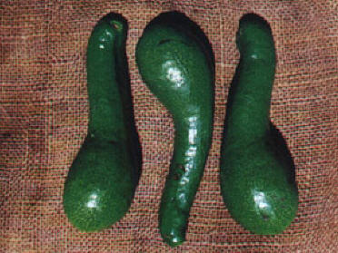 Young branches are very hairy. The leaves are deciduous and the flowers are light greenish-yellow, with the stamens turning red with age. The fruit, closely resembling that of the avocado, is generally pear-shaped, with a thick, green, leathery skin. The flesh is oily with a milky juice and tastes like an avocado or coconut. The pear-shaped fruit is easily mistaken for an avocado. However, it contains a much larger central seed. The flesh has stone cells and a gritty texture that is generally considered