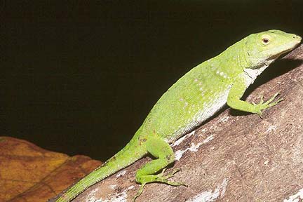 For many years this was known a "chameleon" in the USA because of it's ability to change colors. Males have a large throat fan (dwelap). Some females have a distinct middorsal white stripe or series of diamond-shaped figures.