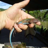 There are several specoes of Ameivas. At first I believed this was the Ameiva festiva and that could still be the case as I'm still learning. The coloring on this is beautiful but it has a head similar to an aligator lizard or monitor, but what it is, I'm not sure. Click on the image to see its belly. No it is not dead! They just sleep easily when turned upside down and have their belly rubbed.