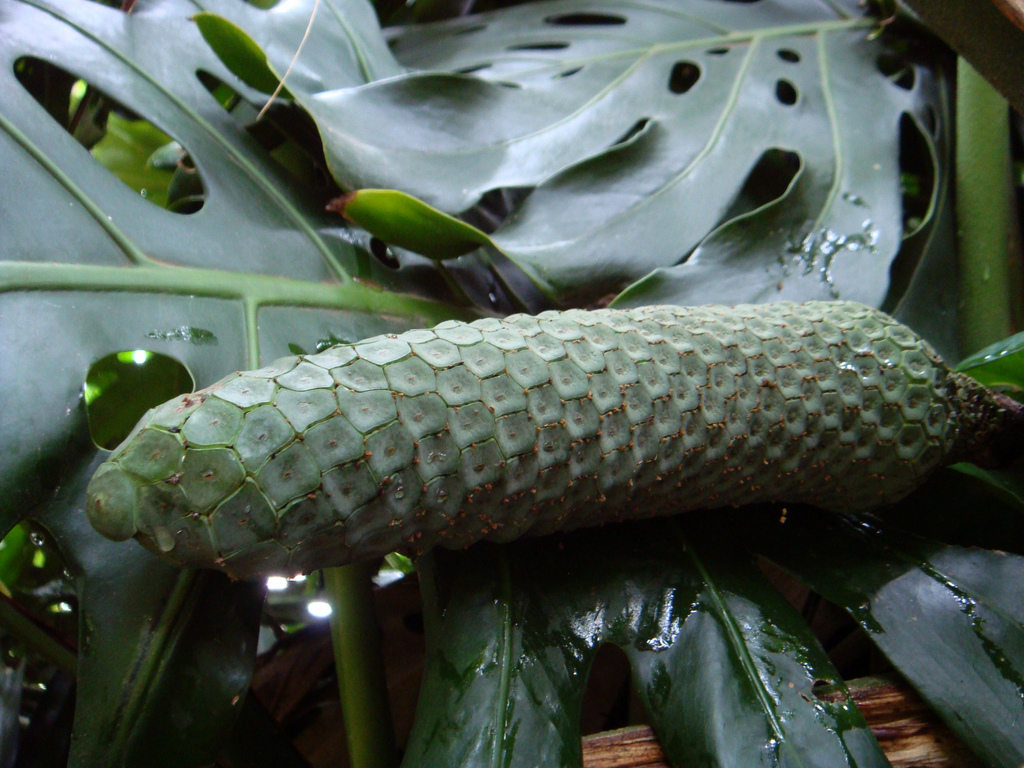 Botanically the fruit produced is a berry. The berries develop later in the season where the time of development varies from species to species. It can take from a few weeks to a year for the berries to develop although most philodendron take a few months. The spathe will enlarge to hold the maturing berries. Once the fruit are mature the spathe will begin to open again, but this time it will break off at the base and fall to the forest floor. Additionally, the berries are edible even though they contain the calcium oxalate crystals, having a taste similar to bananas.