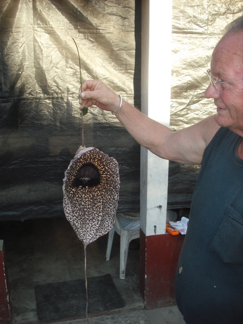 (Aristolochia grandiflora) This is truely an amazing flower! The first one I saw was probably a total of 4 feet in length and beautiful! It's not really a flower you want to give your date though because it smells like something dead. It attracts flies and bugs that like feces and then digests them, they're native to the Caribbean and grow on a vine.